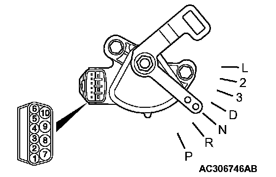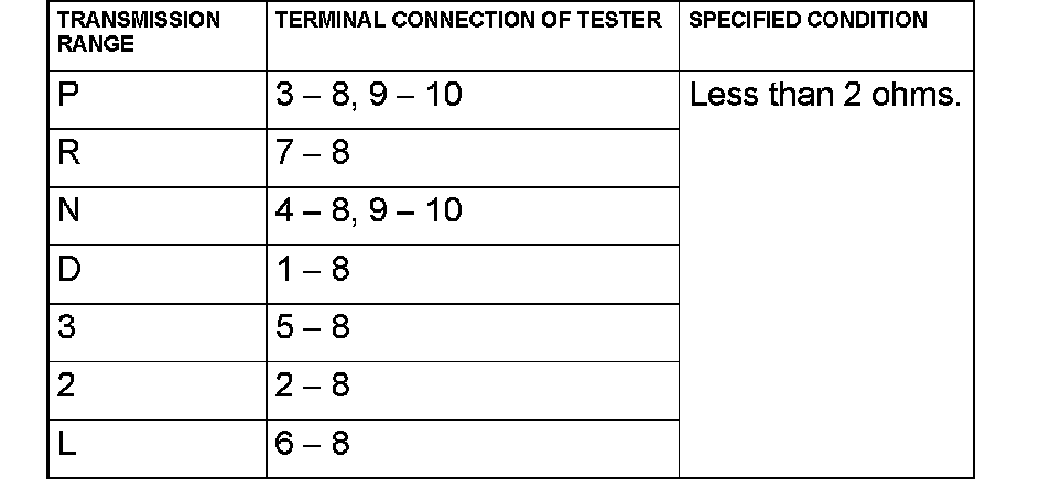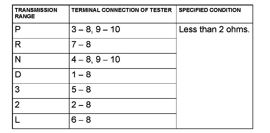 Measure the resistance between the terminals for each transmission range as indicated in the table.