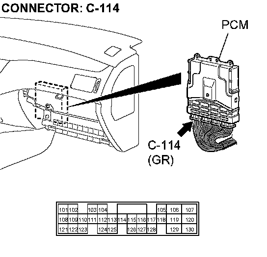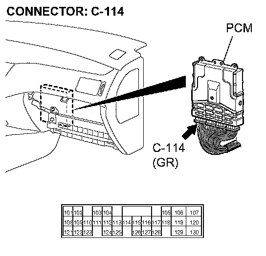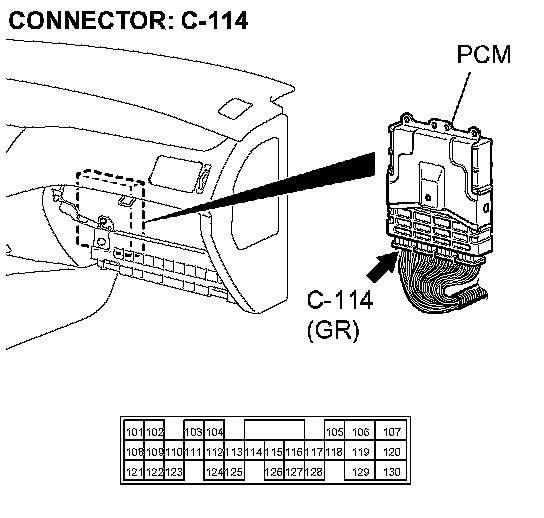 STEP 11. Check PCM connector C-114 for loose, corroded or damaged terminals, or terminals pushed back in the connector.