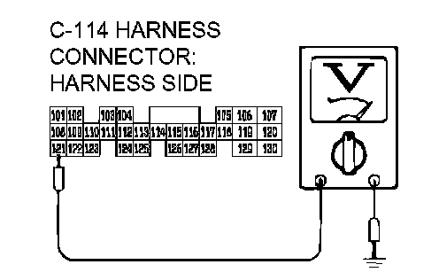 STEP 14. Measure the transmission range switch output voltage at PCM connector C-114 by backprobing.