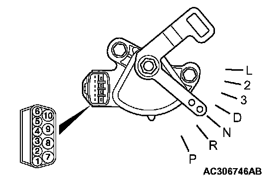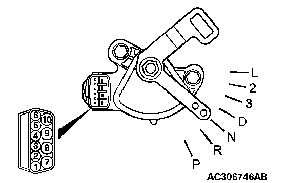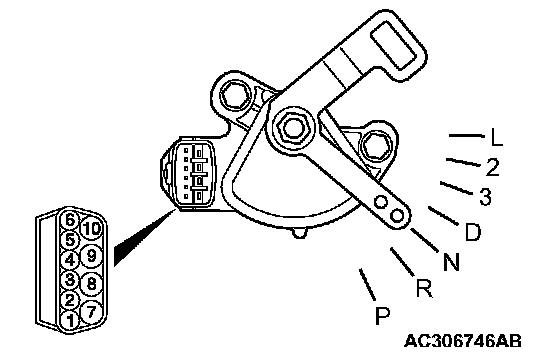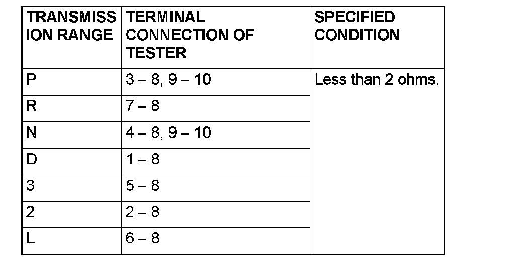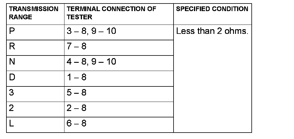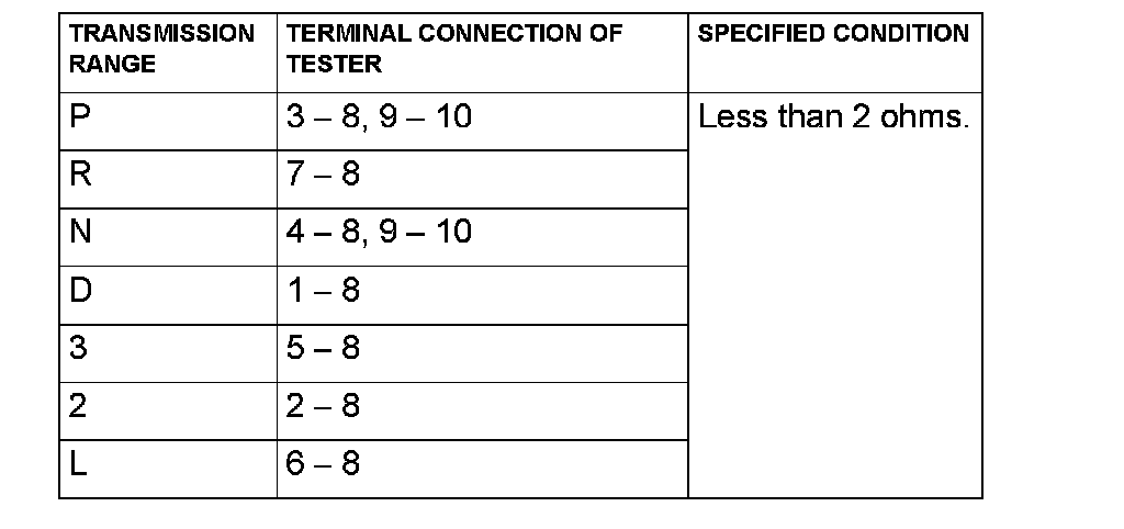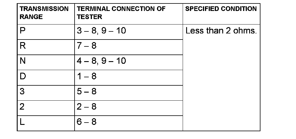 Measure the resistance between the terminals for each transmission range as indicated in the table.
