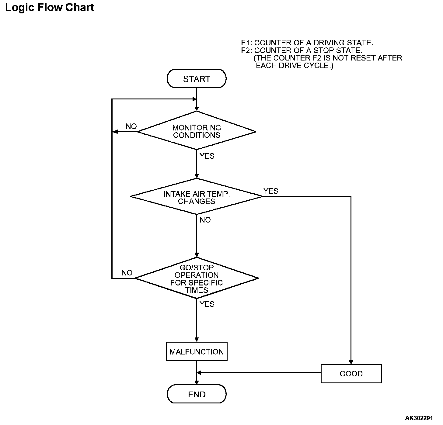 - If the intake air temperature sensor output does not change in spite of repeating the prescribed (stop-and-go) driving pattern, the intake air temperature sensor is determined to be stuck with faulty output.