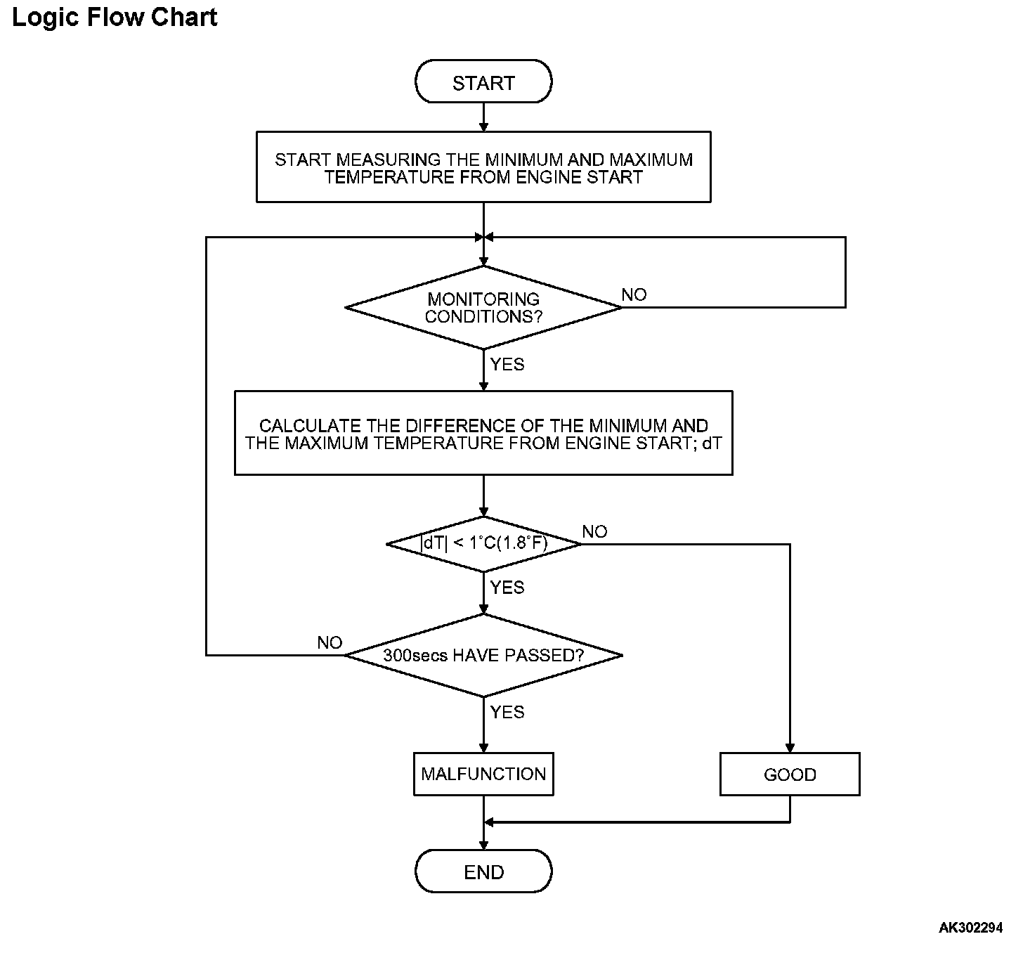 - If the engine coolant temperature sensor output does not change for a prescribed length of time when the engine is started at a minimum coolant temperature of 7 °C (45 °F), the engine coolant temperature sensor is determined to be stuck (at high temperature).