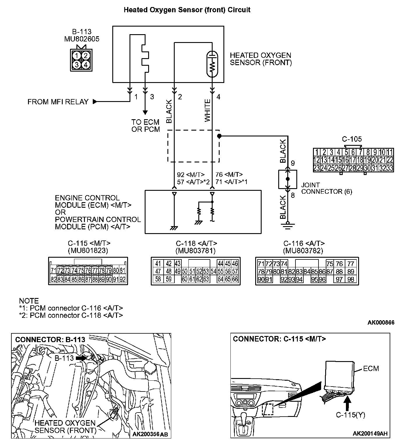 - Terminal No. 2 of the heated oxygen sensor (front) is grounded with ECM (terminal No. 92)