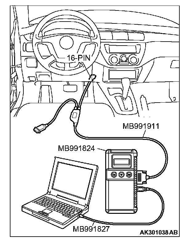 CAUTION: To prevent damage to scan tool MB991958, always turn the ignition switch to the "LOCK" (OFF) position before connecting or disconnecting scan tool or MB991958.