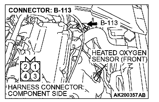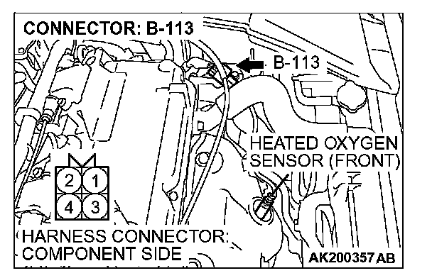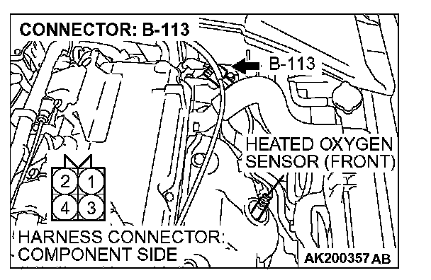 1. Disconnect the heated oxygen sensor (front) connector B-113 and connect test harness special tool, MD998464, to the connector on the heated oxygen sensor (front) side.
