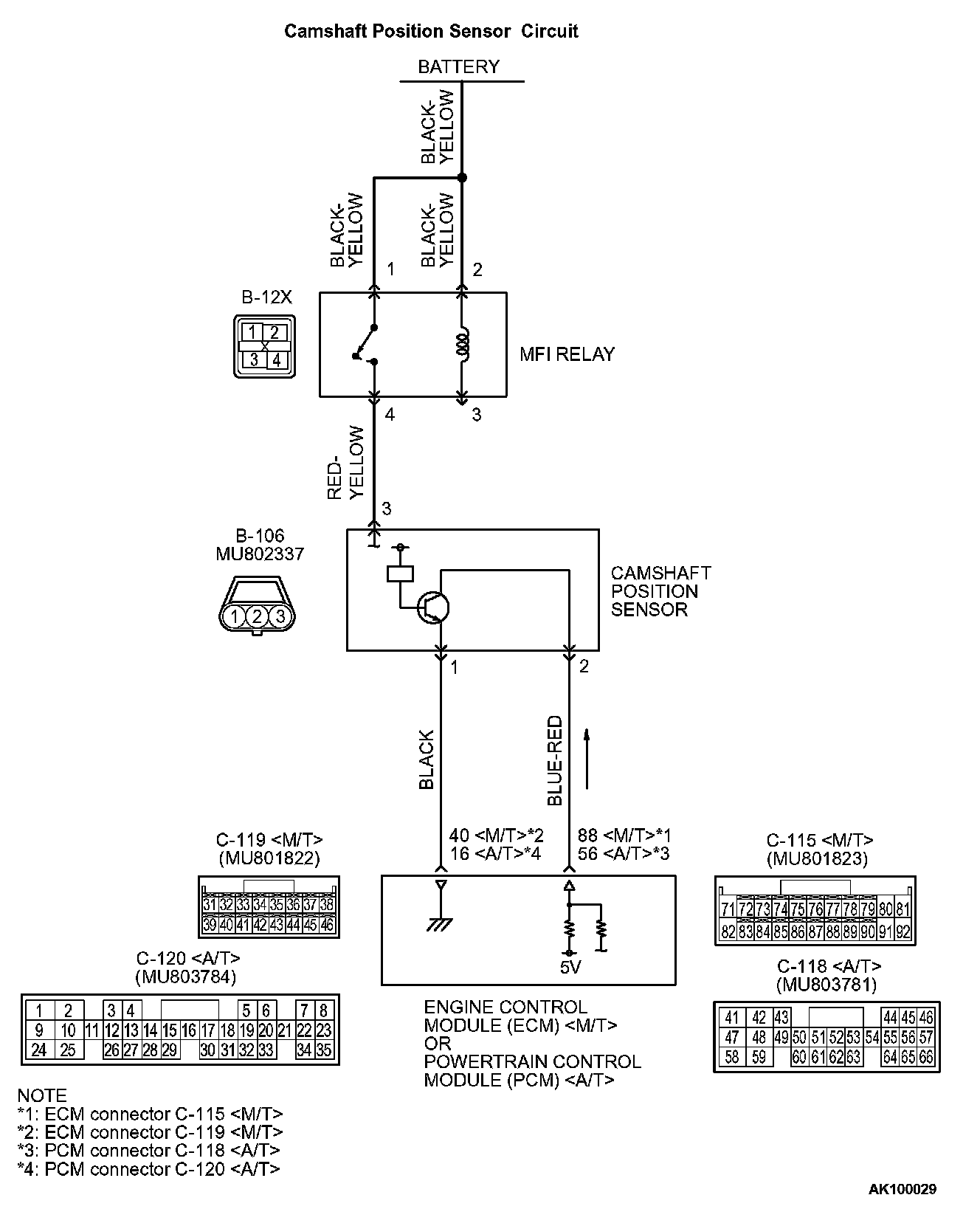 - The camshaft position sensor power is supplied from the MFI relay (terminal No. 4).
