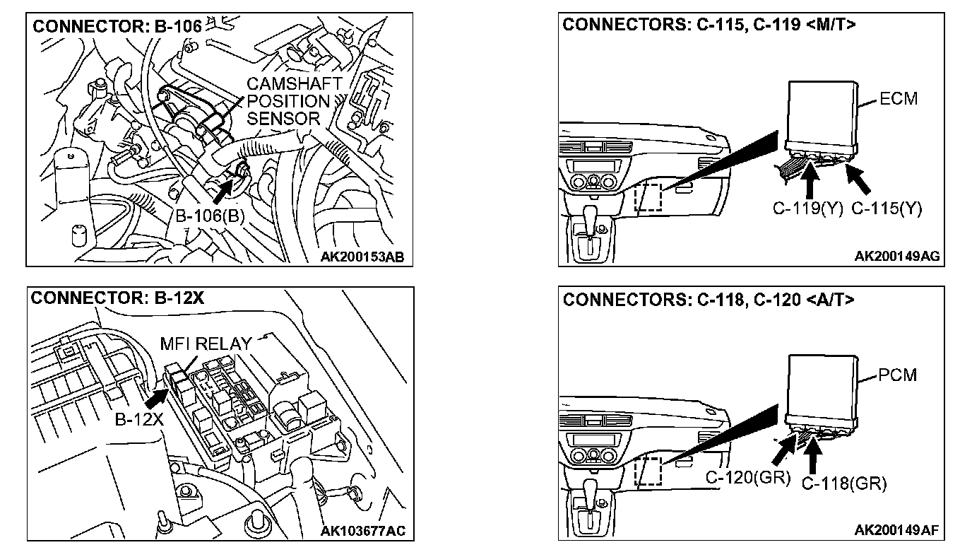 STEP 17. Check for harness damage between MFI relay connector B-12X (terminal No. 4) and camshaft position sensor connector B-106 (terminal No. 3).