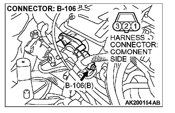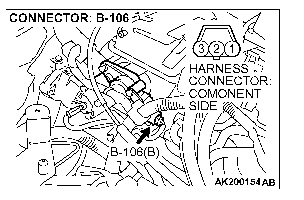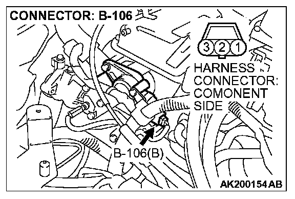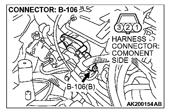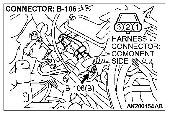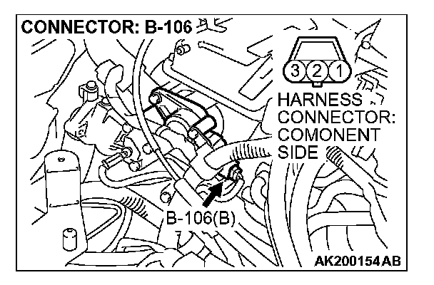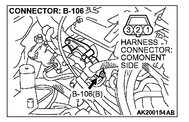 1. Disconnect the camshaft position sensor connector B-106, and connect test harness special tool (MB991709) in between. (All terminals should be connected.)