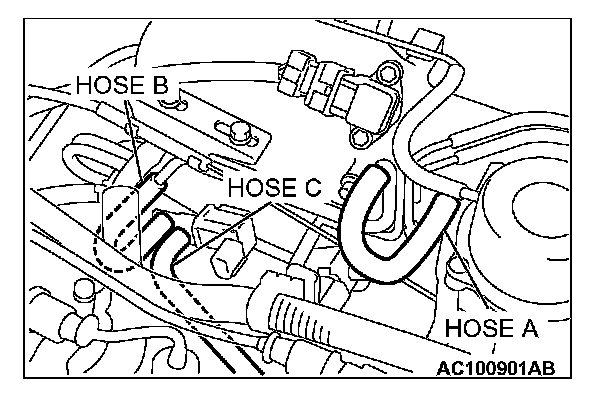 1. Disconnect hose C from the evaporative emission purge solenoid and connect a hand vacuum pump to the nipple of the evaporative emission purge solenoid.