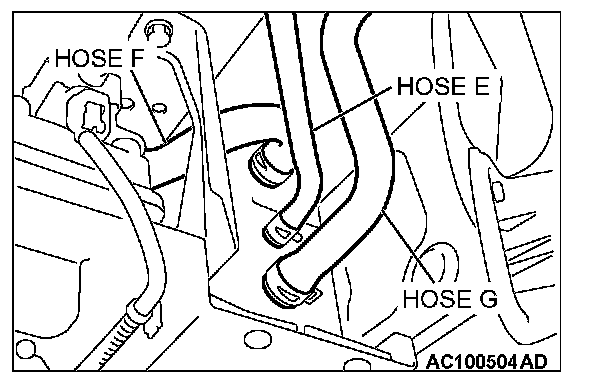 1. Disconnect hoses E, F and G from the evaporative emission canister side, and connect a hand vacuum pump to the evaporative emission canister instead of hose E, and plug the other nipples.