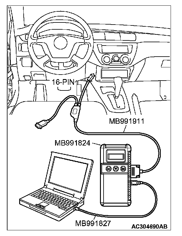 CAUTION: To prevent damage to scan tool MB991958, always turn the ignition switch to the "LOCK" (OFF) position before connecting or disconnecting scan tool MB991958.