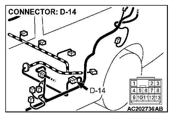 STEP 14. Check the harness wire between fuel tank differential pressure sensor connector D-09 terminal 2 and intermediate connector D-14 terminal 10 for damage.