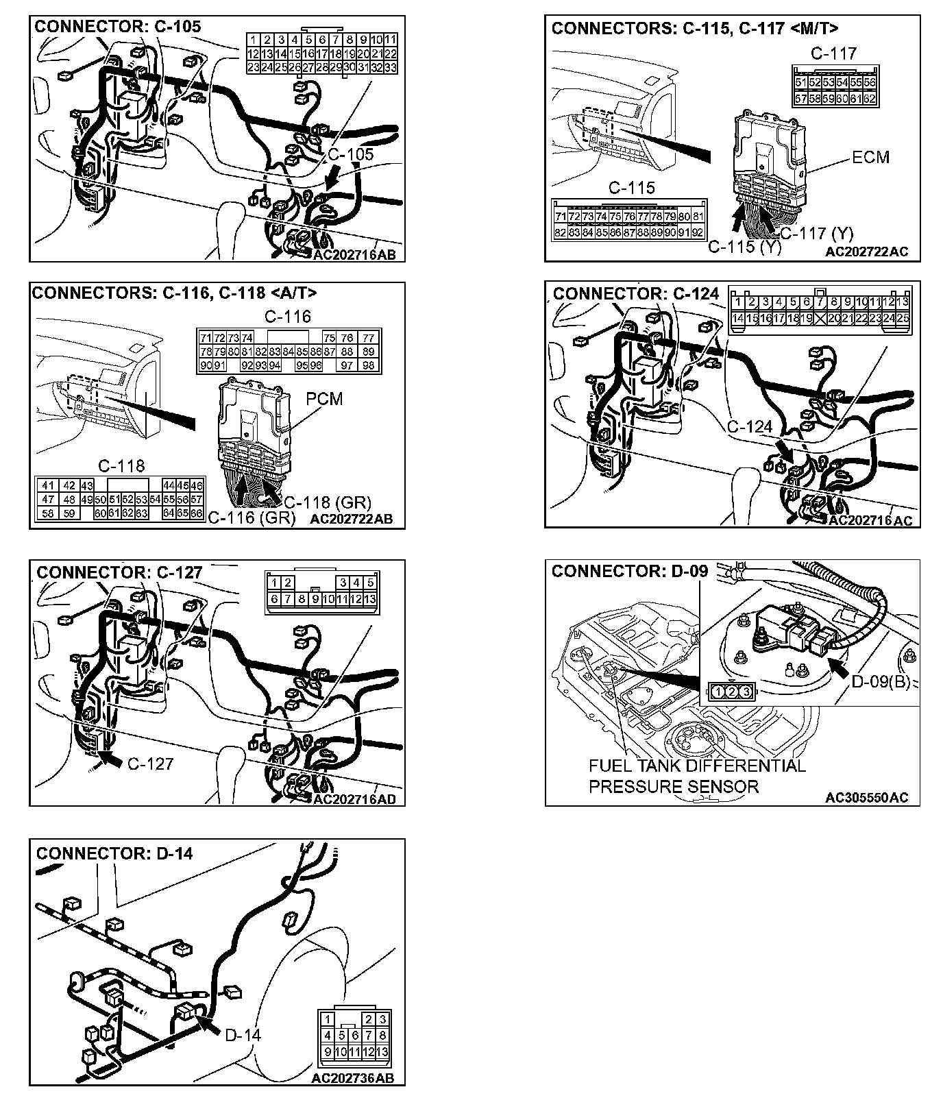 STEP 9. Check intermediate connectors C-105, C-124, C-127, and D-14 and ECM connector C-115