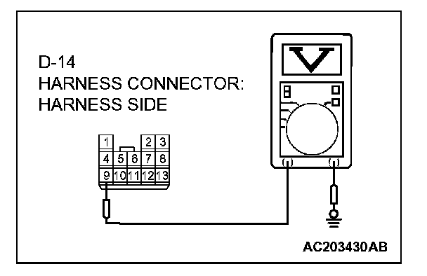 3. Measure the voltage between connector D-14 terminal 9 and ground.