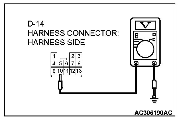 3. Measure the voltage between connector D-14 terminal 10 and ground by backprobing.