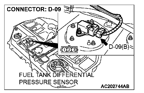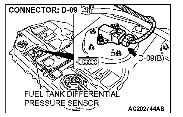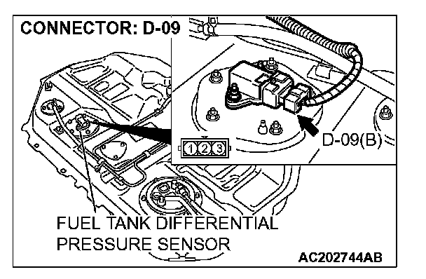 STEP 13. Check fuel tank differential pressure sensor connector D-09 and intermediate connector for D-14 for loose, corroded or damaged terminals, or terminals pushed back in the connector.