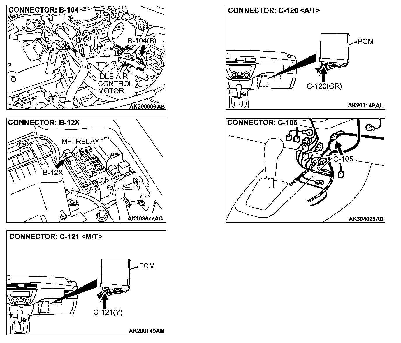 c. Idle air control motor connector B-104 (terminal No. 4) and ECM connector C-121 (terminal No. 5)