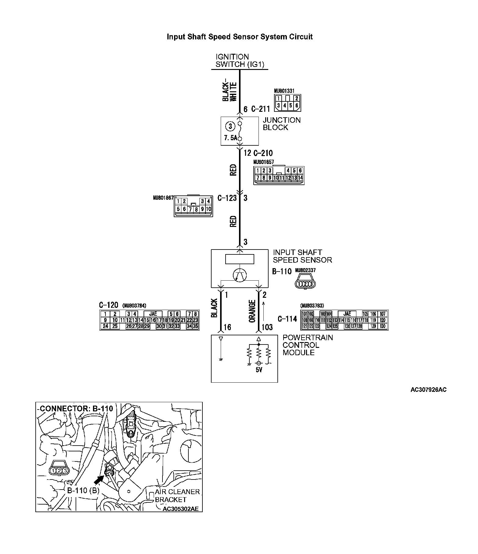 ^ The input shaft speed sensor is connected to the PCM (terminals 16 and 103) via the input shaft speed sensor connector (terminals 1 and 2).