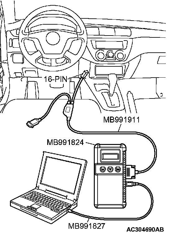 CAUTION: To prevent damage to scan tool MB991958, always turn the ignition switch to the "LOCK" (OFF) position before connecting or disconnecting scan tool MB991958.