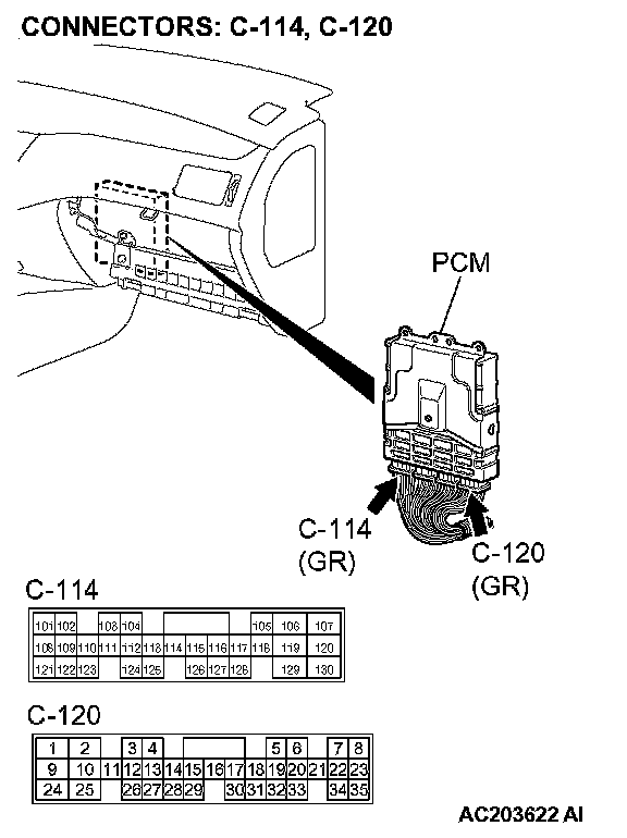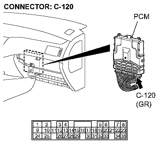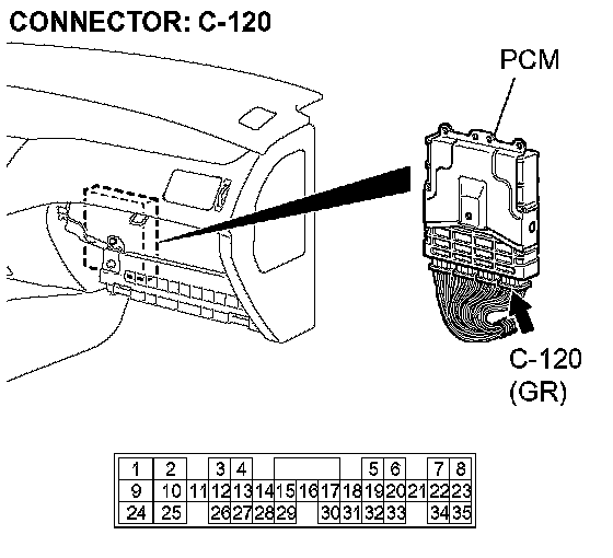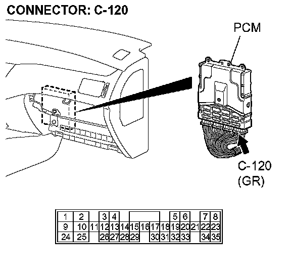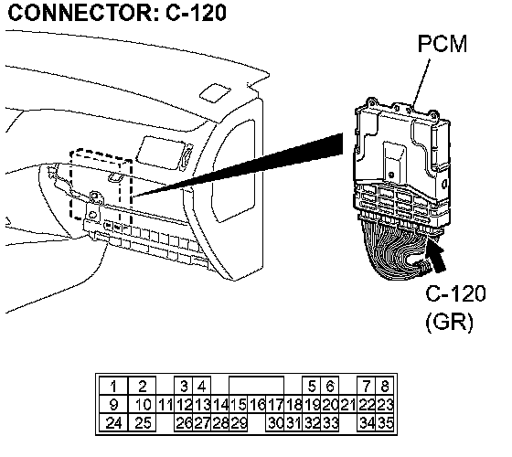 STEP 15. Check PCM connector C-120 for loose, corroded or damaged terminals, or terminals pushed back in the connector.