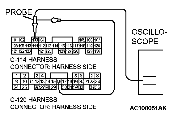 STEP 16. Using the oscilloscope, check the input shaft speed sensor waveform at PCM connectors C-114 and C-120 by backprobing.