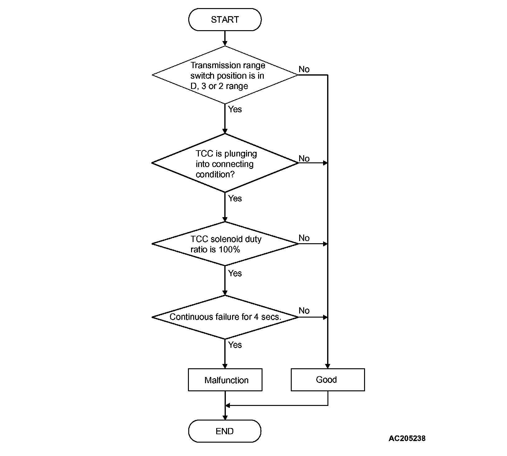 ^ At start of lock-up operation, if lock-up clutch cannot be engaged even when duty ratio of torque converter clutch solenoid remains 100% for more than specified time, PCM judges that torque converter clutch is stuck OFF.