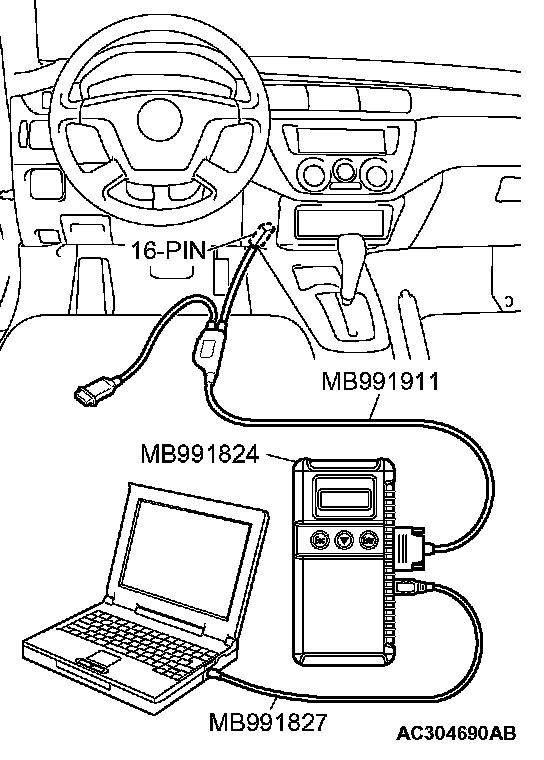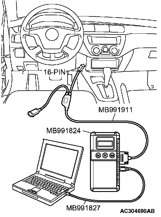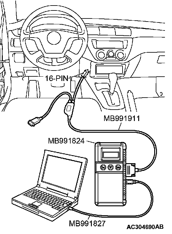 CAUTION: To prevent damage to scan tool MB991958, always turn the ignition switch to the "LOCK" (OFF) position before connecting or disconnecting scan tool MB991958.