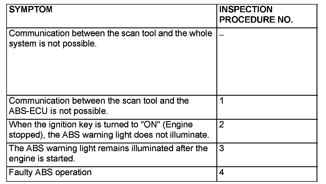 SYMPTOM CHARTNOTE: If steering movements are made when driving at high speed, or when driving on road surface, with low frictional resistance, or when passing over bumps, the ABS may operate although sudden braking is not being applied. Because of this, when getting information from the customer, check if the problem occurred while driving under such conditions as these.