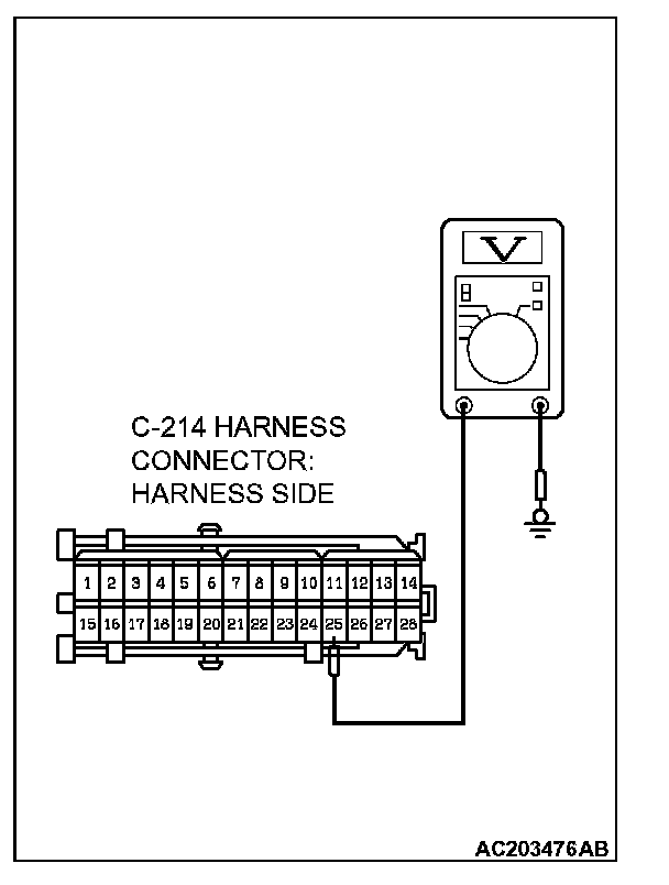 3. Measure the voltage between junction block connector C-214 terminal 25 and ground by backprobing.
