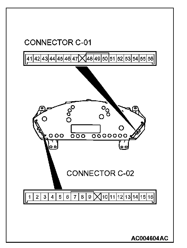 STEP 5. Check combination meter connectors C-01, C-02 and intermediate connector C-21 for loose, corroded or damaged terminals, or terminals pushed back in the connector.