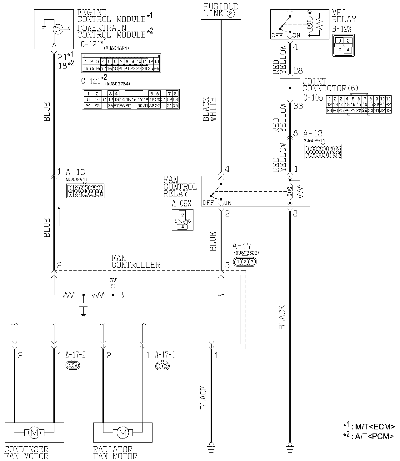 ^ The ECM [M/T] or PCM [A/T] judges the required revolution speed of radiator fan motor and condenser fan motor using the input signals transmitted from A/C switch, automatic compressor controller, vehicle speed sensor and engine coolant temperature sensor. The ECM [M/T] or PCM [A/T] activates the fan controller to drive the radiator fan motor and condenser fan motor.