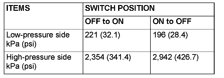 3. When the high/low pressure sides of the dual pressure switch are at operation pressure (ON) the resistance should less than two ohms between the terminals. If open circuit, replace the switch.