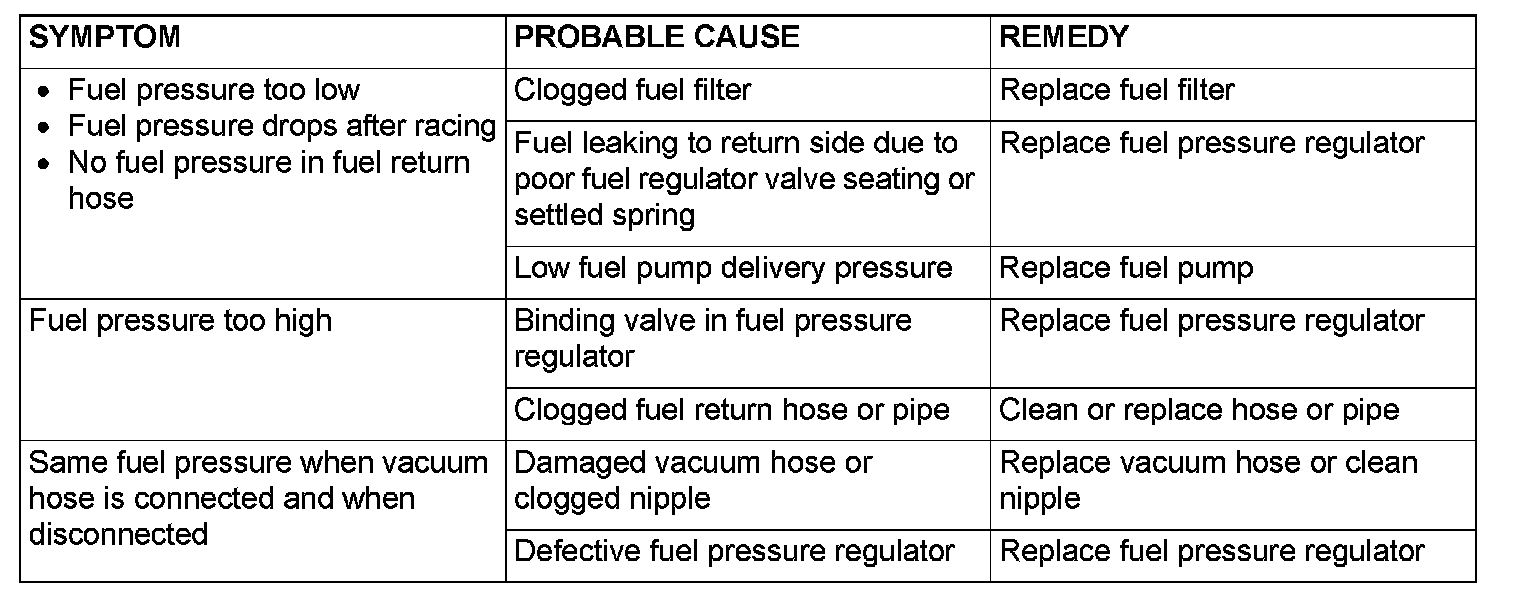 12. If any of fuel pressure measured in steps 10 to 13 is out of specification, troubleshoot and repair according to the table.