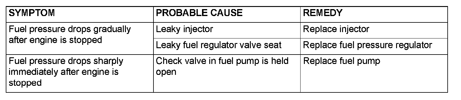 13. Stop the engine and observe fuel pressure gauge reading. It is normal if the reading does not drop within two minutes. If it does, observe the rate of drop and troubleshoot and repair according to the table. Start, then stop the engine.