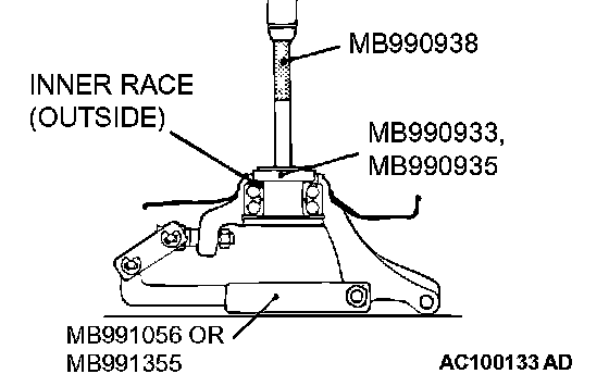3. Install the inner race (outside) that was removed from the hub to the wheel bearing, and then use special tools MB990933 [Vehicles without center bearing: LL, L], MB990935 [Vehicles without center bearing: M, SPORT, Vehicles with center bearing], MB990938, MB991056 or MB991355 to remove the wheel bearing.
