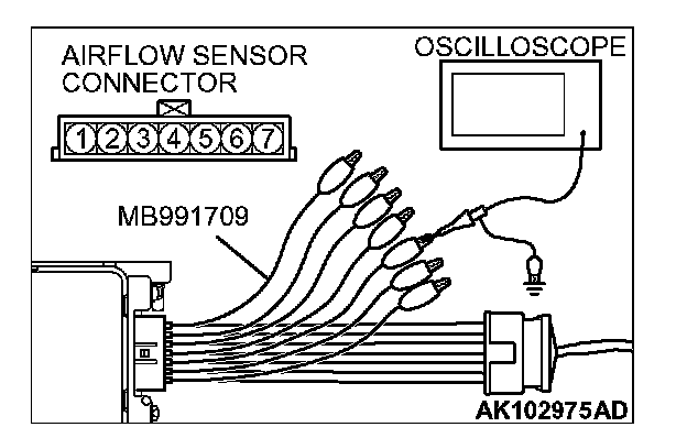 1. Disconnect the volume airflow sensor connector, and connect the test harness special tool (MB991709) in between. (All terminals should be connected.)