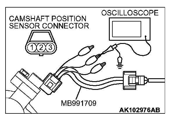 1. Disconnect the camshaft position sensor connector, and connect the test harness special tool (MB991709) in between. (All terminals should be connected.)