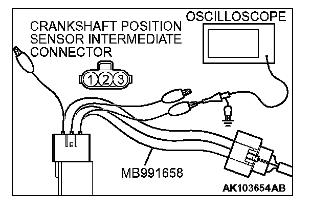 3. Disconnect the crankshaft position sensor connector, and connect the test harness special tool (MB991658) in between. (All terminals should be connected.)