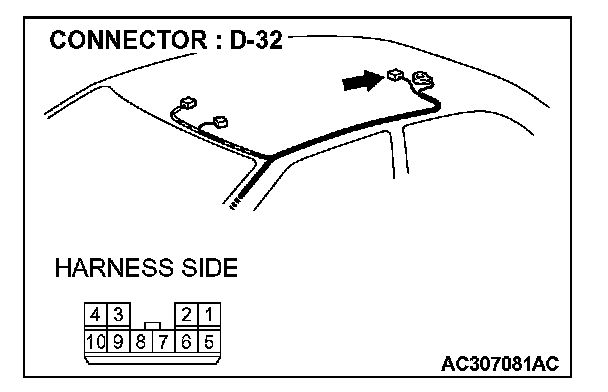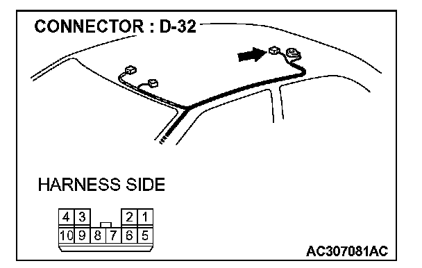 STEP 1. Check sunroof motor assembly connector D-32 for loose, corroded or damaged terminals, or terminals pushed back in the connector.