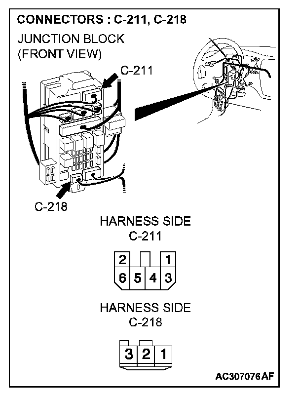 NOTE: Also check junction block connectors C-211 and C-218 for loose, corroded, or damaged terminals, or terminals pushed back in the connector. If junction block connector C-211 or C-218 is damaged, repair or replace the damaged component(s) as described in Harness Connector Inspection.