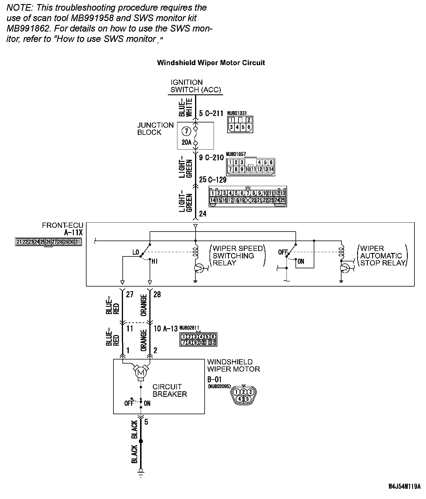 - If the SWS communication line is defective, the front-ECU operates windshield wiper motor by using the other communication lines (wiper backup circuit) instead of that line. In this case, the windshield wiper works at low speed regardless of the windshield wiper and washer switch positions ("LOW" or "HIGH").