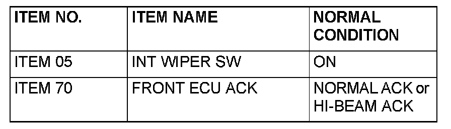 The scan tool does not show the respective normal condition for item "FRONT ECU ACK" : Replace the front-ECU. Verify that the windshield wiper works normally.