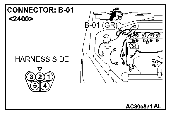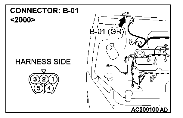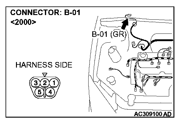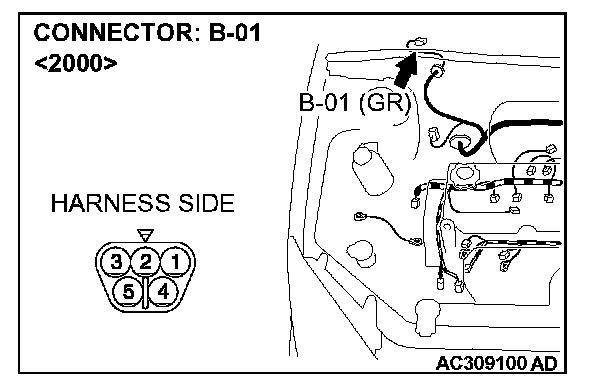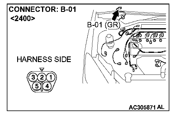STEP 3. Check windshield wiper motor connector B-01 for loose, corroded or damaged terminals, or terminals pushed back in the connector.