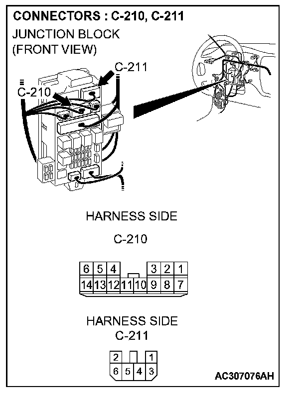 NOTE: Also check intermediate connector C-129, junction block connectors C-210 and C-211 and joint connector C-101 for loose, corroded, or damaged terminals, or terminals pushed back in the connector. If intermediate connector C-129, junction block connector C-210 or C-211 or joint connector C-101 is damaged, repair or replace the damaged component(s) as described in Harness Connector Inspection.