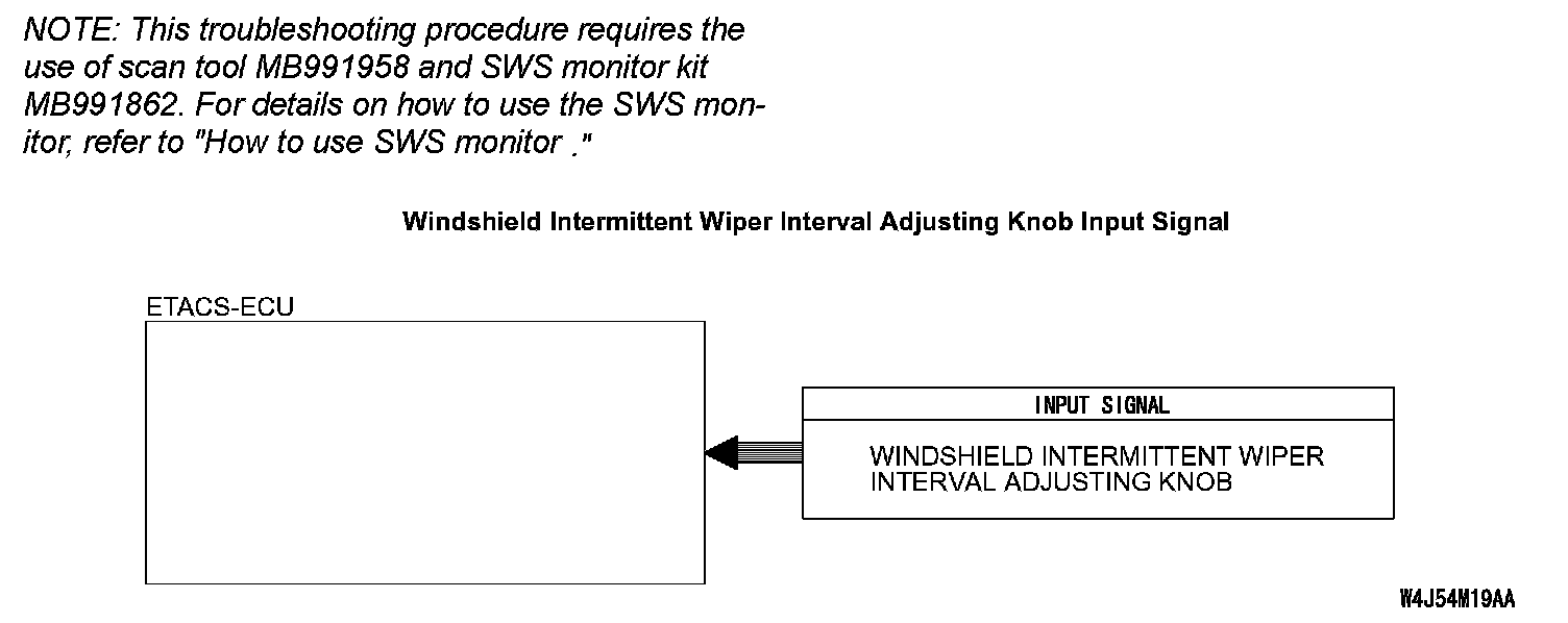 If the windshield intermittent wiper interval is not changed by operating the windshield intermittent wiper interval adjusting knob or according to the vehicle speed, the column switch, the ETACS-ECU or the front-ECU may be defective.