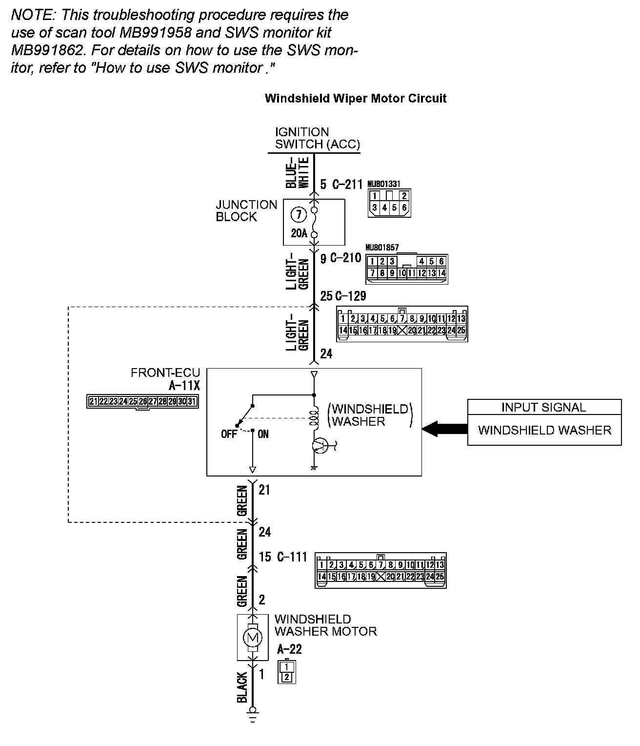STEP 9. Check the wiring harness between windshield washer motor connector A-22 (terminal 2) and front-ECU connector A-11X (terminal 21).