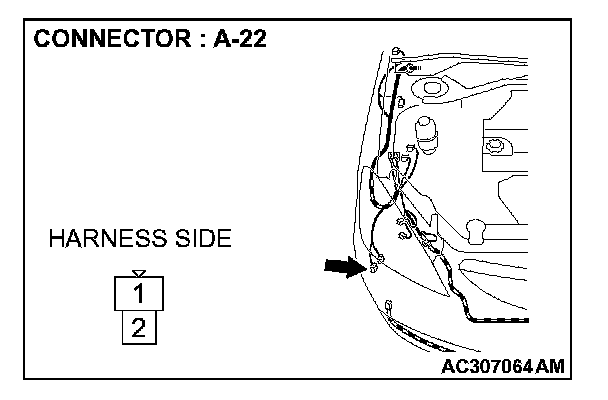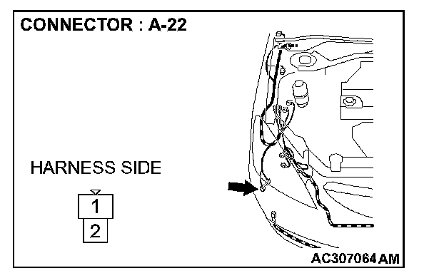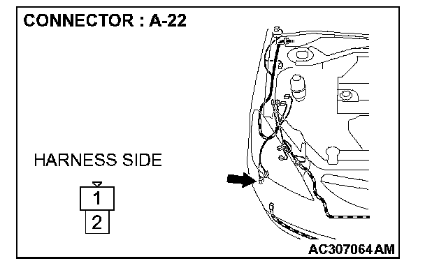 STEP 4. Check windshield washer motor connector A-22 for loose, corroded or damaged terminals, or terminals pushed back in the connector.