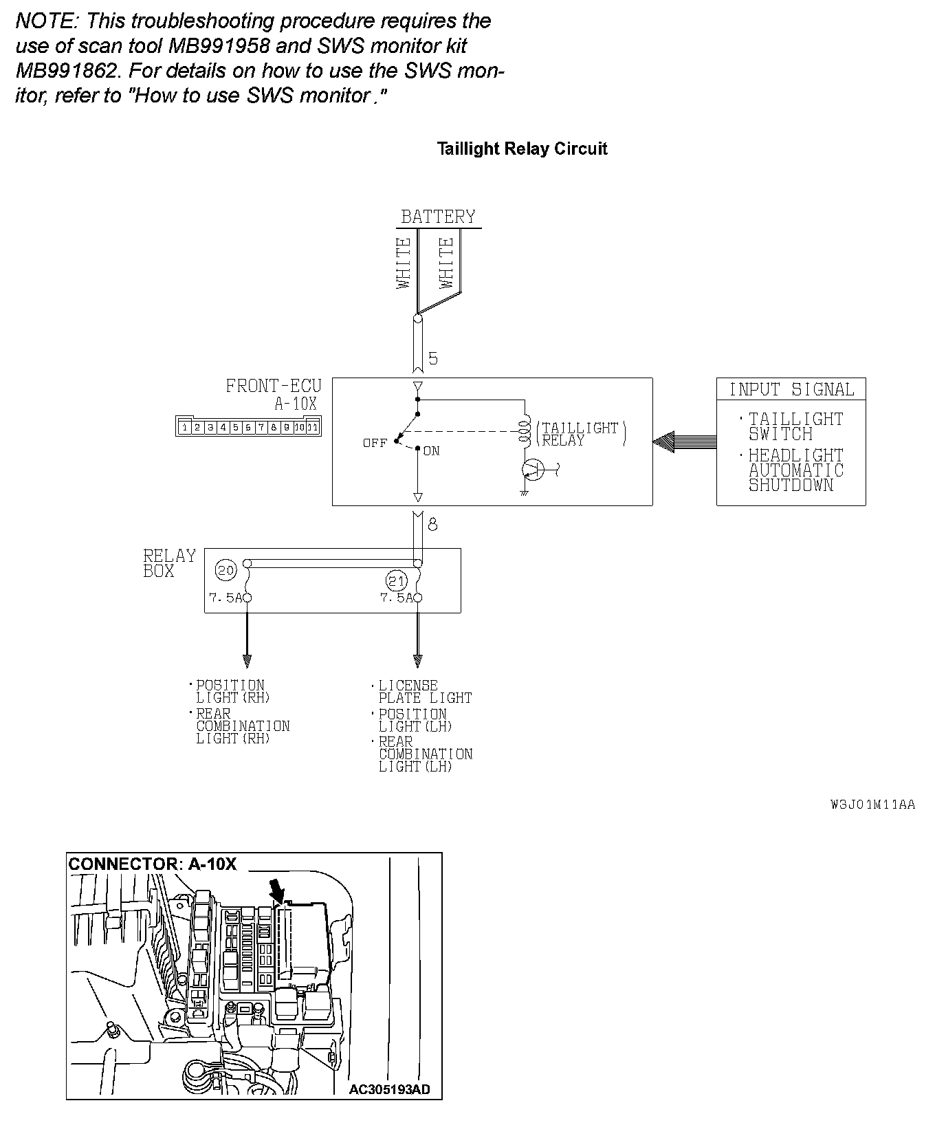 When the lighting switch is set to "TAIL" position, the "TAIL" signal is sent through the column-ECU (incorporated in the column switch) to the front-ECU. IF the front-ECU receives the "TAIL" signal through the column-ECU, the front-ECU turns on the taillight relay (incorporated in the front-ECU), thus causing the taillights to illuminate.