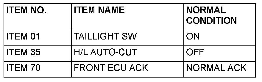 Q: Are normal conditions displayed on the "TAILLIGHT SW", "H/L AUTO-CUT" and "FRONT ECU ACK"?