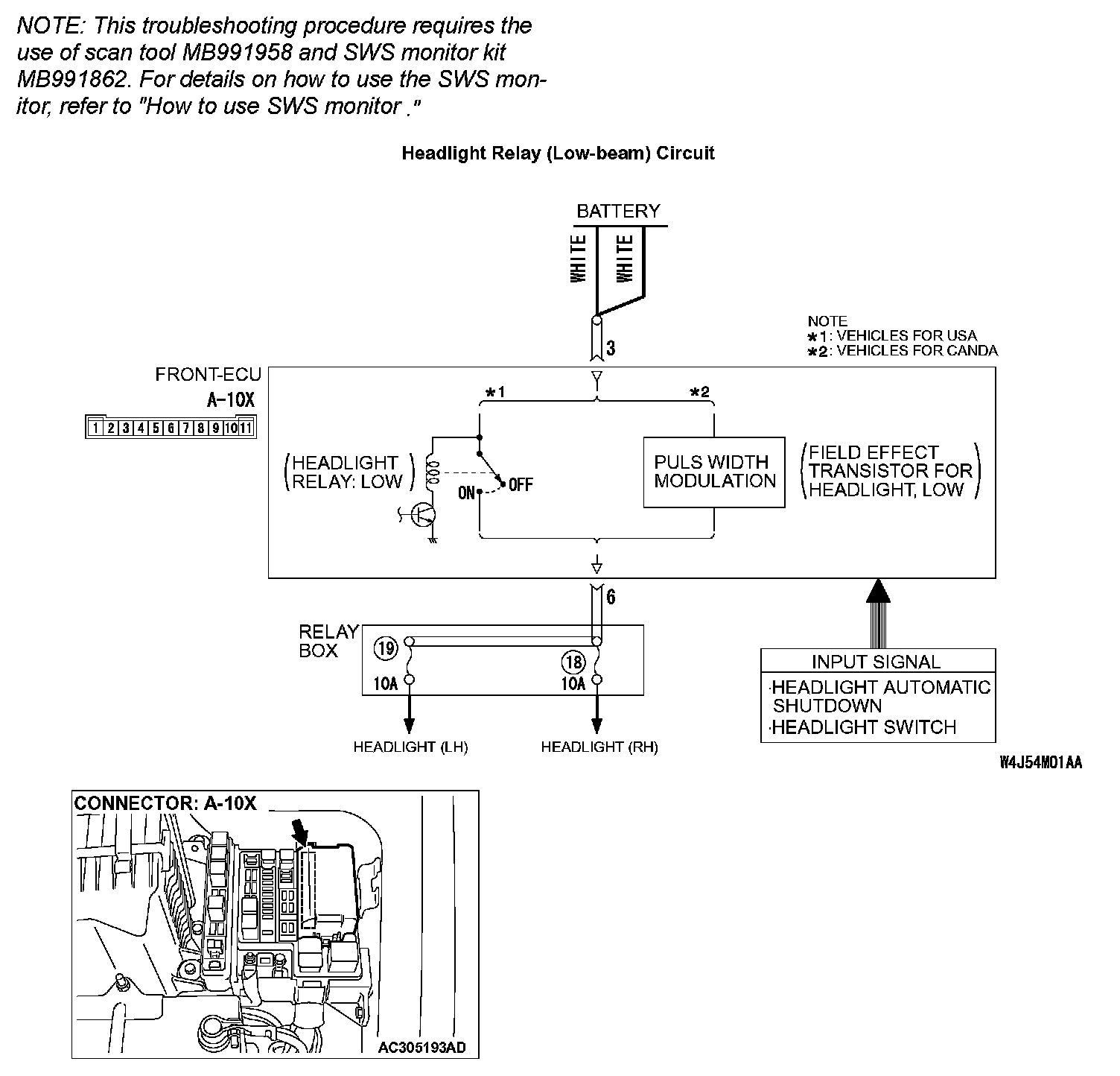 If the headlights (low-beam) do not illuminate normally, the column switch or the front-ECU may be defective.
